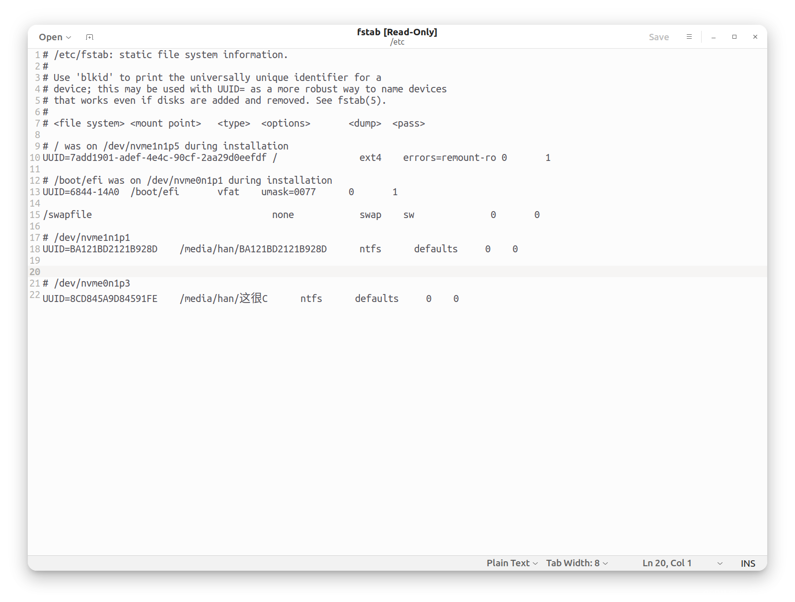 修改好之后,还有重要的一步,我们必须提前手动创建挂载目录。我这里选择的两个目标挂载目录是/media/han/BA121BD2121B928D和/media/han/这很C,大家根据自己的目录路径自行更改。