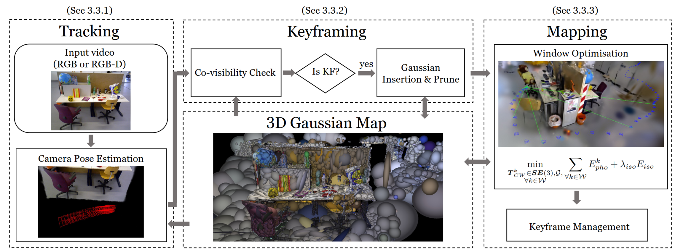 GS-SLAM同样是使用3DGS进行场景重建的SLAM方法,与splaTAM不同的是,GS-SLAM完成了单目SLAM的任务,而不是splaTAM的RGB-D输入,因此,GS-SLAM需要来自SFM估计的准确位姿。GS-SLAM也可以无缝拓展到RGB-D的SLAM。此外,通过利用gaussian的显式性质,GS-SLAM引入几何验证和正则化来处理gaussian在densify中出现的歧义。