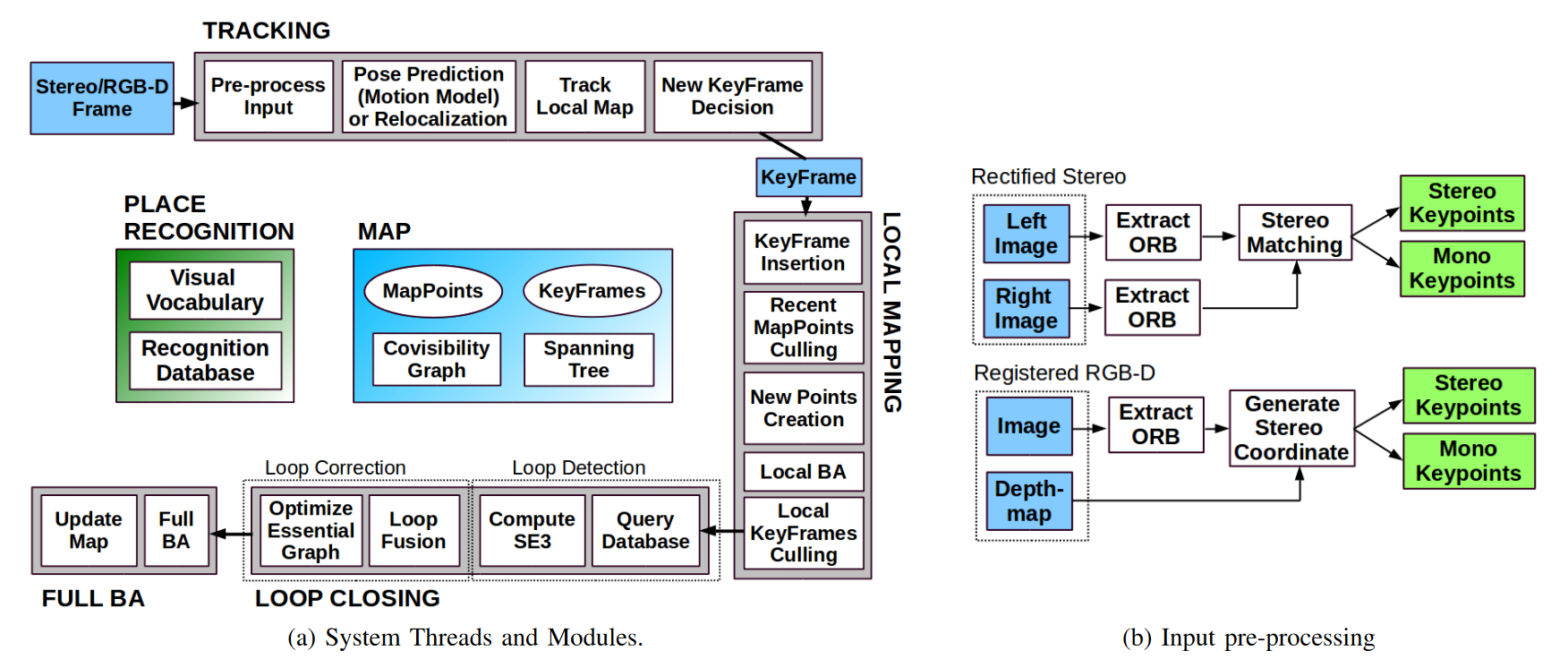 ORB-SLAM2的总体概述如上,它具有3个主要的并行线程,