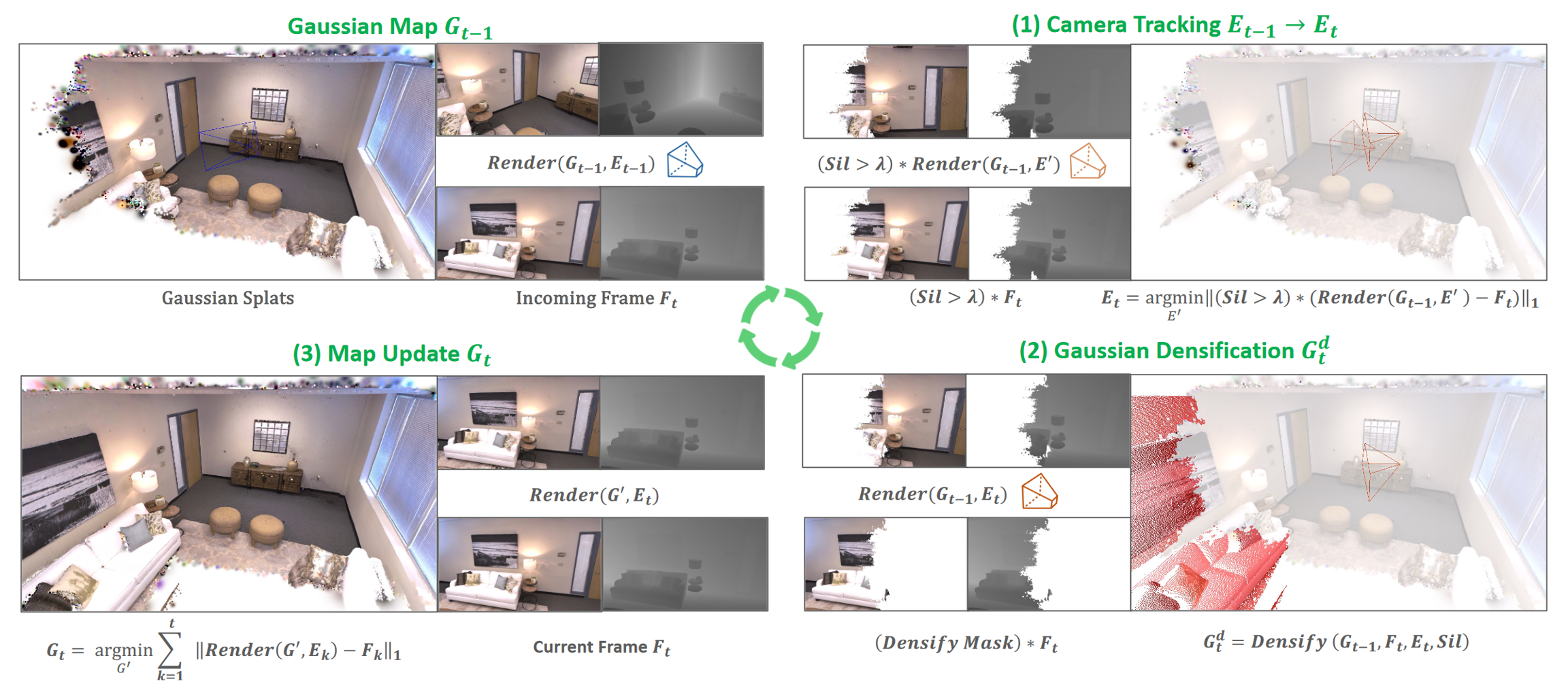Map Update:给定从第1帧到t+1帧的相机姿势,通过最小化t+1帧之前所有图像的RGB和深度误差来更新场景中所有高斯的参数。