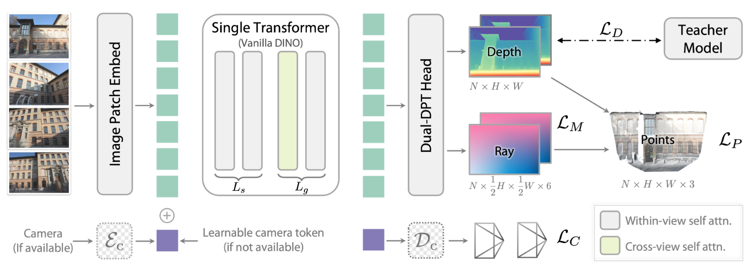 阶段二 (Cross-View): 在后 Lg 层,将所有图像的 Token 拼接到一起。此时的 Self-Attention 变成了跨视图注意力,允许不同图片之间的像素进行交互和匹配。