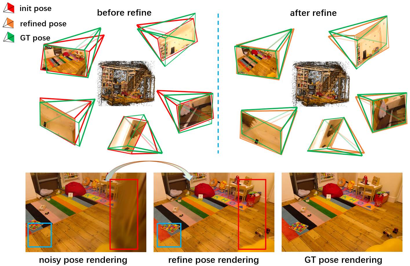 由于相机位姿的误差,优化算法(如Adam)可能会在优化过程中陷入局部最优解,无法收敛到正确的场景表示和相机位置。