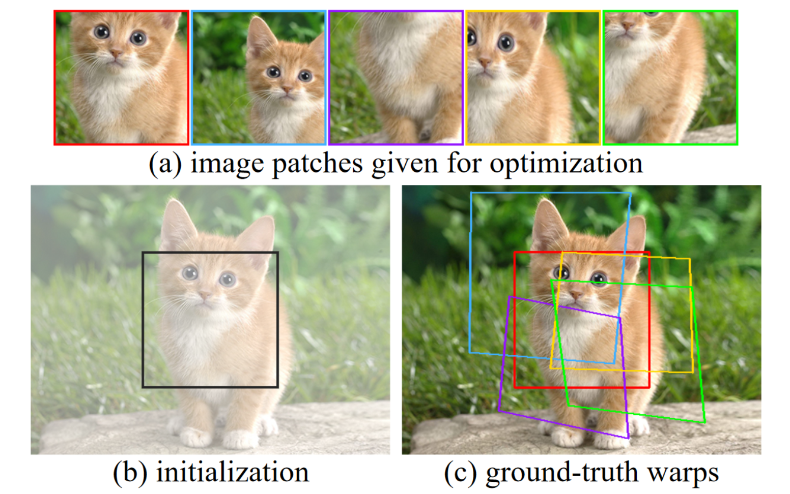 给定图像块,barf的目标是恢复整个图像的对齐和神经网络重建,其中初始化为(b)中所示的中心裁剪,而相应的真实变换(ground-truth warps)如(c)所示。