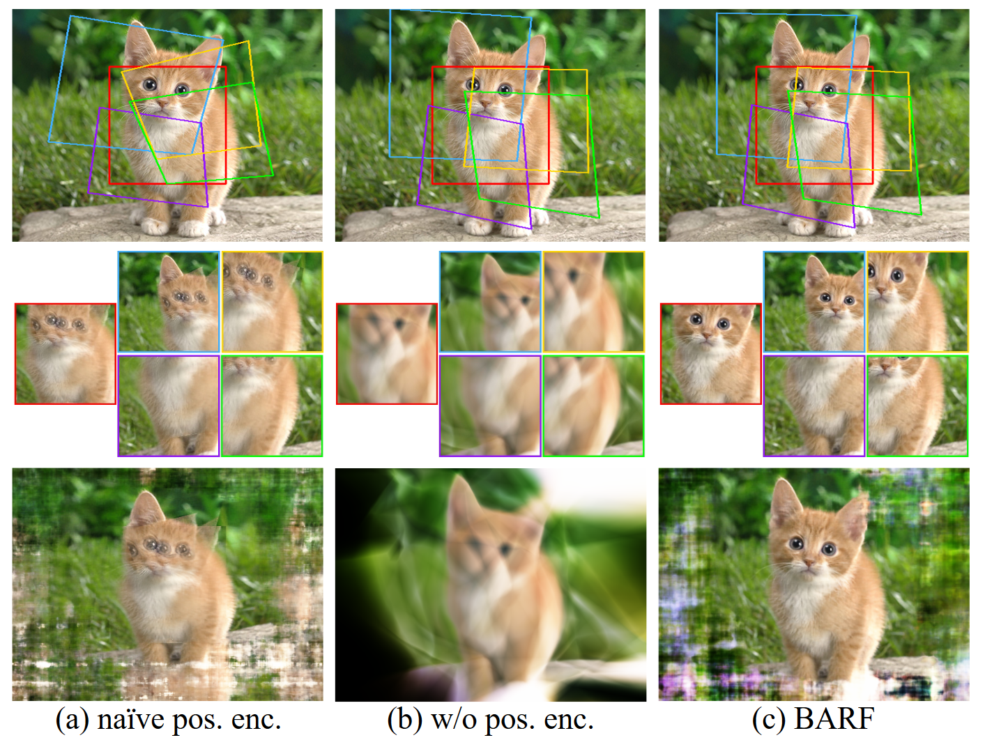 它将来自MLP的梯度信号放大,并且其方向以相同频率变化。这使得预测有效更新Δp变得困难,因为来自采样的3D点的梯度信号在方向和幅度方面是不相干的,并且很容易相互抵消。因此,对于barf的联合优化来说,不能直接应用位置编码。