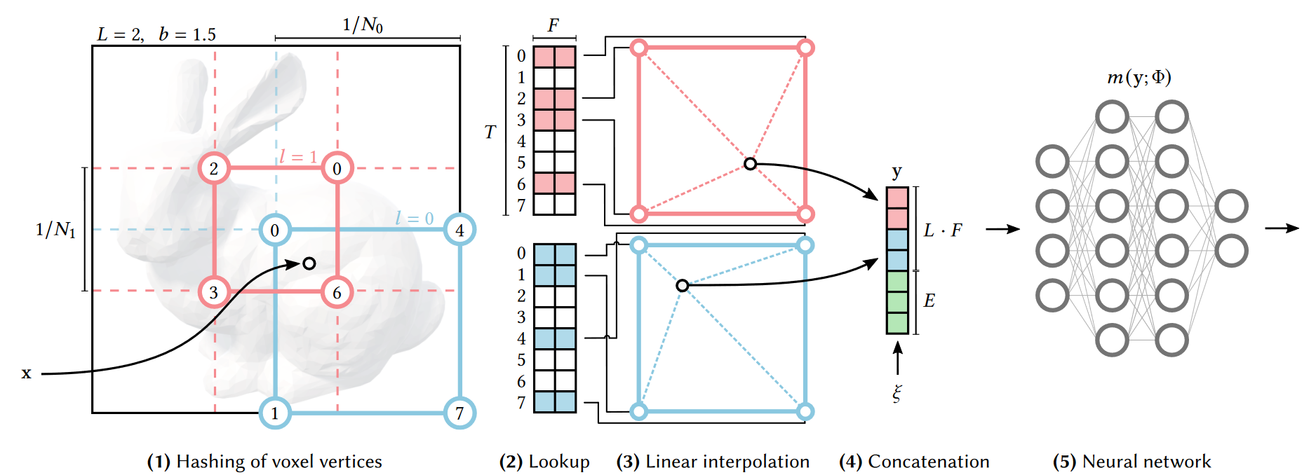 根据输入坐标,在不同分辨率的网格下各自选取8个角点,进行d线性插值(𝑑-linear interpolation),