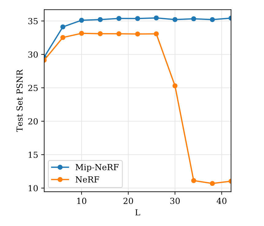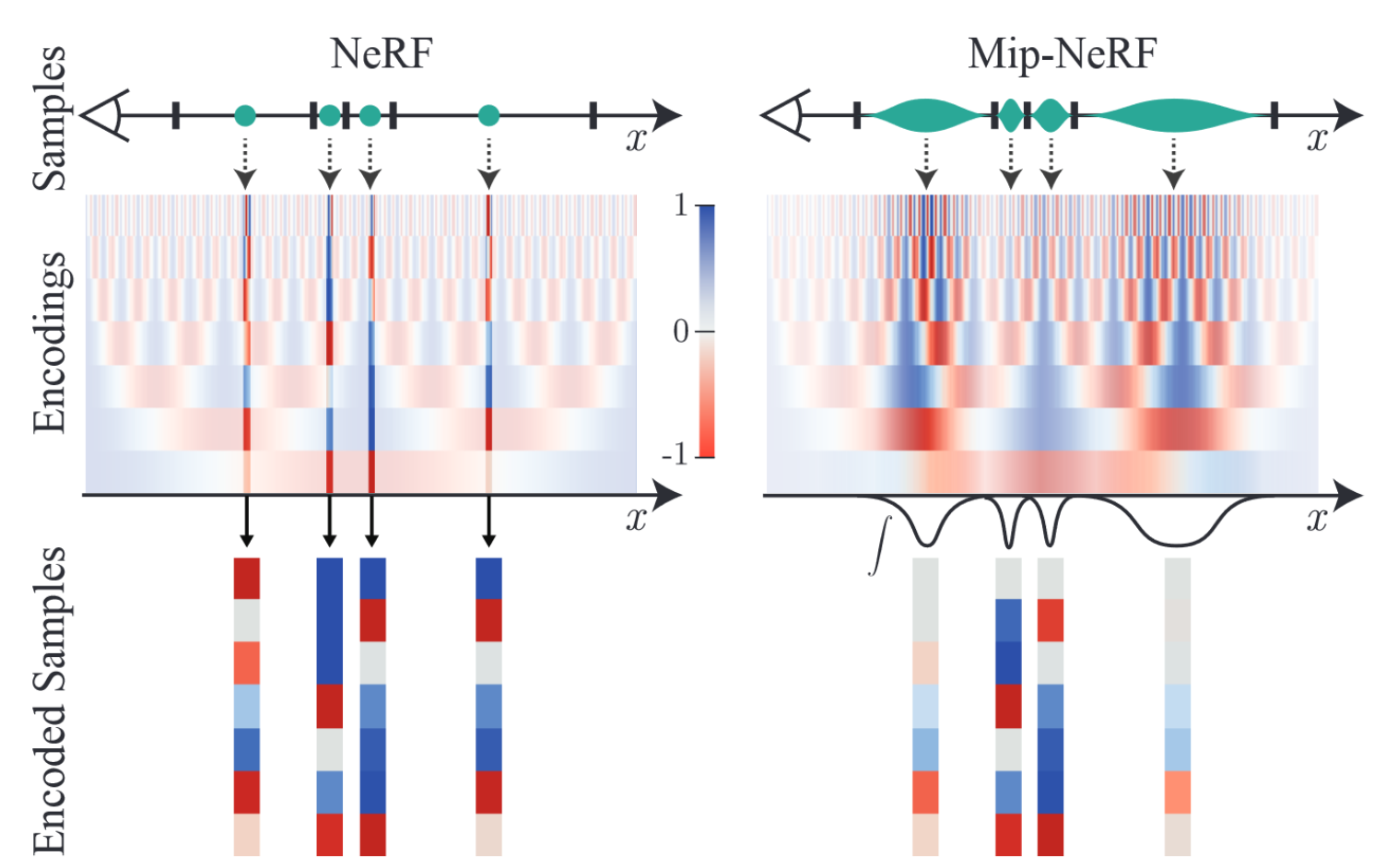 MipNerf准确描述了像素包含区域随着远近变化的关系。图中,Encodings从下到上表示从低频到高频,Encodings的高度取决了超参数L,可以看到,随着距离的增大,采样的圆台的范围也随之增加(即积分区域越大),又由于高频部分的周期很小(图中红色和蓝色的宽度),进而得到的IPE的积分在高频范围就变成了0,从而消除了高频的成分,Encoded Samples对应部分也变成了灰色。