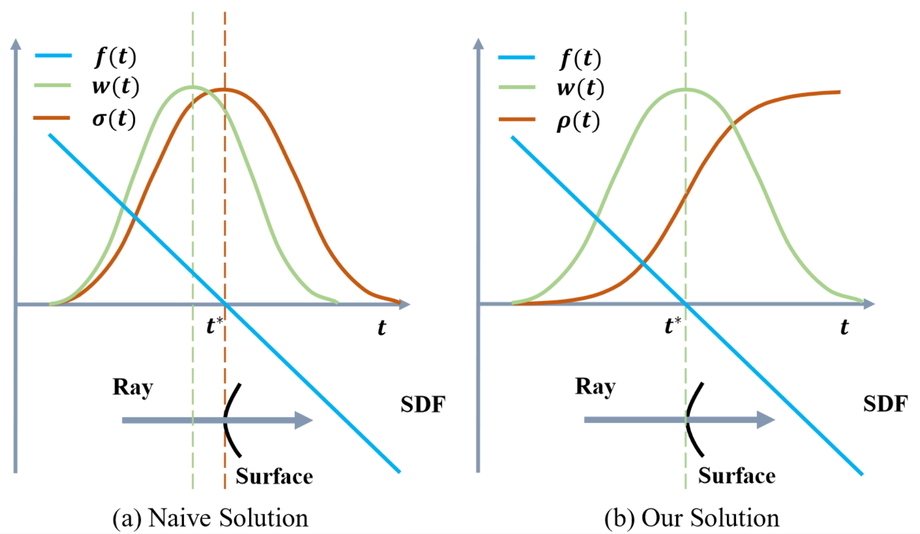 NeuS证明了如果使用Naive Solution,就不满足无偏性,于是NeuS提出了自己的w(t),并通过一些数学推导(本文从略),得到了σ(t)的表达式,为了与原式区分,文献中用ρ(t)表示: