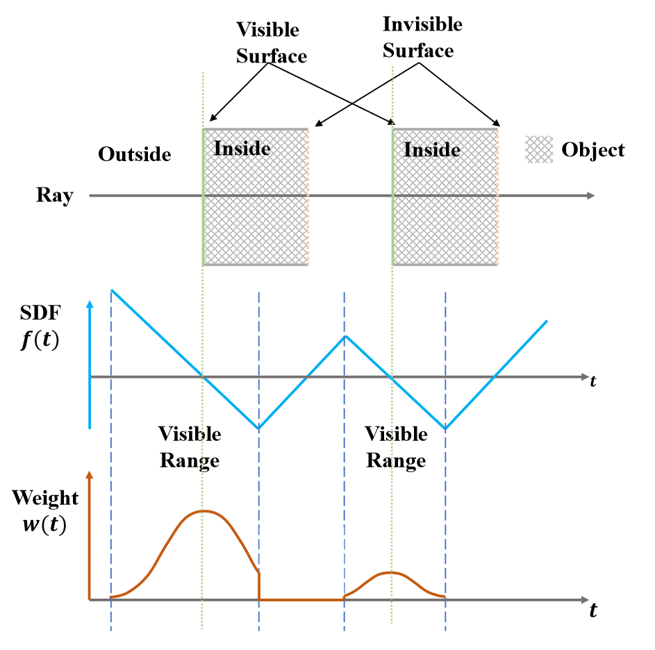 关于第二点,翻译一下,就是如果出现一条光线上两个点SDF值相同时,距离相机更近的点应该具有更大的权重。