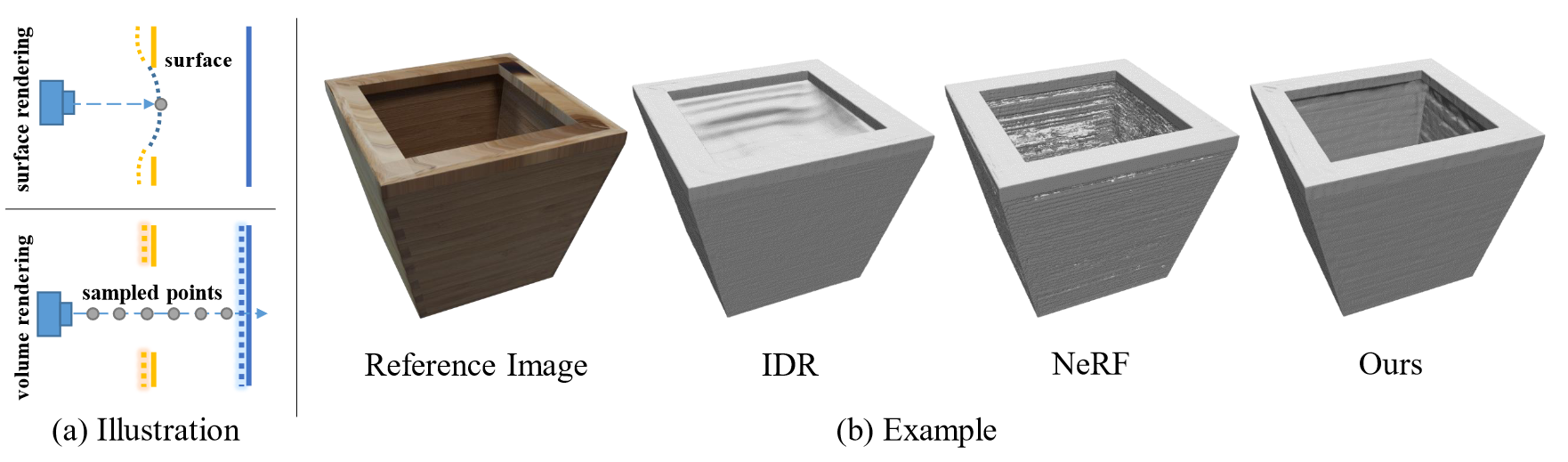 Surface Rendering方法只是考虑每条射线与物体表面相交的单个交点(如a所示),从而无法重建具有复杂结构的物体表面(如b所示)。具体原因是,梯度只存在于射线与表面相交的这个单点,这对于有效的反向传播来说太局部了,并且当物体表面的深度发生突变时,优化会陷入不良的局部最小值。此外,Surface Rendering方法还需要前景掩膜作为收敛到有效表面的监督。