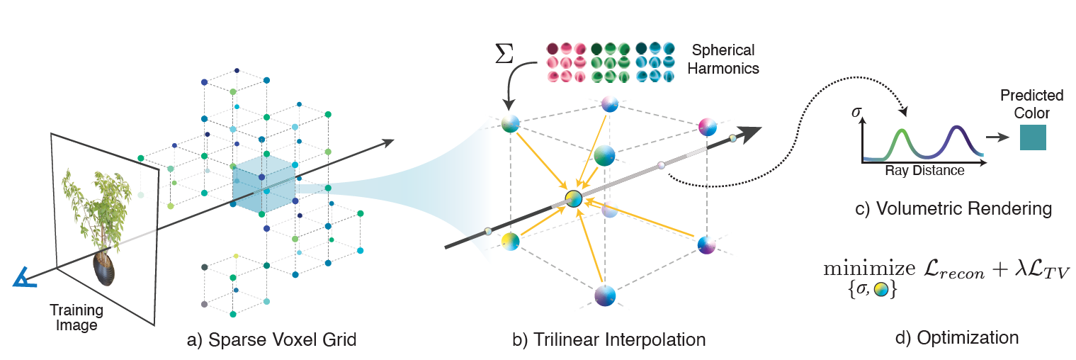 传统的nerf具有训练时间太长的缺点,因为nerf使用Position Encoding把大量信息存储在网络权重中,信息完全储存在网络中会导致计算很慢,网络表达能力也会受到限制。Plenoxels提出将场景表示为稀疏3D网络,在网络的格点上存储σ和球谐系数,并通过三线性插值的方法计算任意采样点的σ和球谐系数,从而取代了原本nerf中MLP的部分,实现了在渲染质量没有损失的情况下,比nerf优化速度快两个数量级。