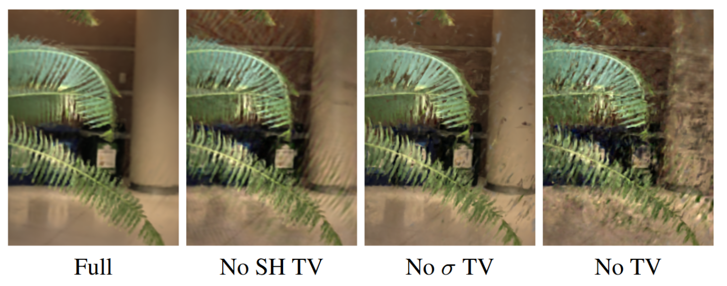 由于grid参数的优化是完全独立的,这很可能会导致训练过程中因为视角分布导致失真问题。譬如,某部分网格的参数能够很好的应付训练集视角的渲染,而另一部分网格由于前面的这些网格承担了大部分的渲染任务,使得它只存了较少的参数。在进行新视角合成的时候,这两部分网格参数的割裂感就会以伪影的形式展示出来。